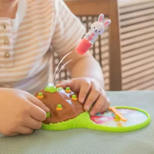 Pörgesd meg a szerencsekereket, találd meg a mezőn elrejtett répák közül azt, amelyik színben passzol ahhoz, amit kipörgettél, aztán ügyeskedd bele a kosárba egy aranyos, nyuszis csipesszel. Ez a rész nem könnyű, még felnőtteknek sem: a répák szeretnek kicsúszni a nyuszi mancsai közül, és minél inkább megpróbálod őket megragadni, annál inkább menekülnének...