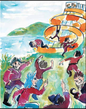– De itt hagyták ezt az ördögi szerkezetet – méregette egy kék hajú kalóz a vízicsúszdát.
