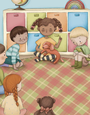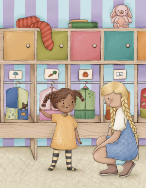 Mi történik az óvodában? Csupa ismerős helyzet: érkezéskor át kell öltözni, ami közben már jókat lehet barátkozni a többi gyerekkel – és a szülők is hasznos információcserébe kezdhetnek; beszélgetős kör, ahol a gyerekek még jobban megismerhetik egymást, megmutathatják magukat, megoszthatják az otthon történteket; reggeli, ahol nem mindenki ugyanazt eszi, mert vannak laktózérzékenyek is a csoportban; hatalmas játék az udvaron mindig más kalanddal; ebéd, amiről minden gyereknek van valami fantáziája, miért lesz szuper vagy pont nem neki való; délutáni alvás az elmaradhatatlan meséléssel; uzsonna, kreatívkodás, közös játék, amíg a szülők meg nem érkeznek. Ezek persze a keretek – az élet sava-borsa a gyerekeken és az óvó néniken, gondozókon múlik.