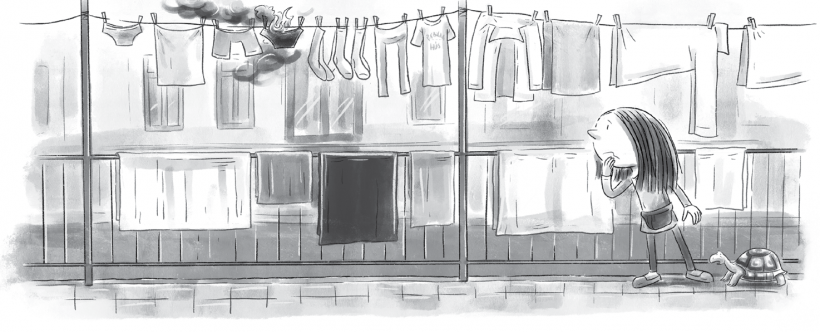 Mimi ijedten felsikított, és néhány másodpercig csak dermedten állt. Aztán letépte a gatyát a szárítóról, ledobta a földre, és rátaposott. Közben Teusz, a teknőse is megjelent a gangon, és érdeklődve figyelte, mi történik.