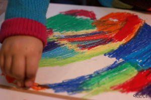 Rögzítsétek papír ragasztószalaggal a rajzlapot az asztalhoz, hogy a beszínezés közben ne mozogjon, ne gyűrődjön, és az egész lapot teljesen színezzétek be az olajpasztellel.