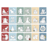 - Karácsonyi motívumok: A lapok különféle karácsonyi jeleneteket ábrázolnak, mint például Mikulás, hóember, ajándékok, karácsonyfa és ünnepi díszek.