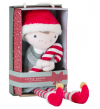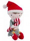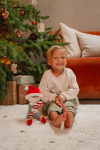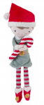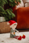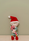 Piros sapkával a fején és hozzá illő ruhában fogja a piros cukorkáját. A kezén lévő tépőzárnak köszönhetően szorosan meg tudja fogni.