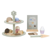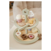 Ideje egy teadélutánnak – stílusosan és játékosan! A Little Dutch fából készült emeletes sütemény kínálója egy varázslatos teázós játékhoz nyújt inspirációt minden kis cukrász és vendéglátó számára. A háromszintes állványon helyet kapott muffin, keksz, színes macaronok – mindegyik csábító finomságot idéz. A mellékelt süteményes lapáttal a gyerekek felszolgálhatják a desszerteket, a menükártyán szereplő illusztrációk segítségével pedig vendégeik ki is választhatják a kedvencüket. A játék nemcsak a szerepjáték örömét nyújtja, hanem segíti a kommunikáció, a képzelőerő és a szociális készségek fejlődését is.