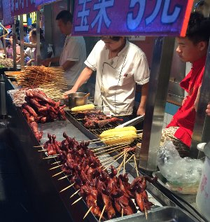 András: Érthető módon legszívesebben a sáskaevést mesélem. Ez a Peking Wangfujing nevű részén található, úgynevezett éjszakai piacon történt. Ezen a bóvliárusokkal és kifőzdékkel teli elvarázsolt helyen szinte kizárólag emberi fogyasztásra csak erős megszorításokkal alkalmas élőlényeket kínálnak a helyi lacikonyhák. Úgy emlékszem, a legszolídabb opció a galamb saslik volt. Itt, miután megtekintettük a pálcikára tűzött skorpiókból, madárpókokból és denevérekből álló felhozatalt, egy társaságunkhoz tartozó kalandvágyó könyvkiadó javaslatára többen megkóstoltuk a sült sáskát. Ez inkább kinézetre volt bizarr, az íze félúton volt valahol a mikróban grillezett sneci és a Nógrádi ropi között.
